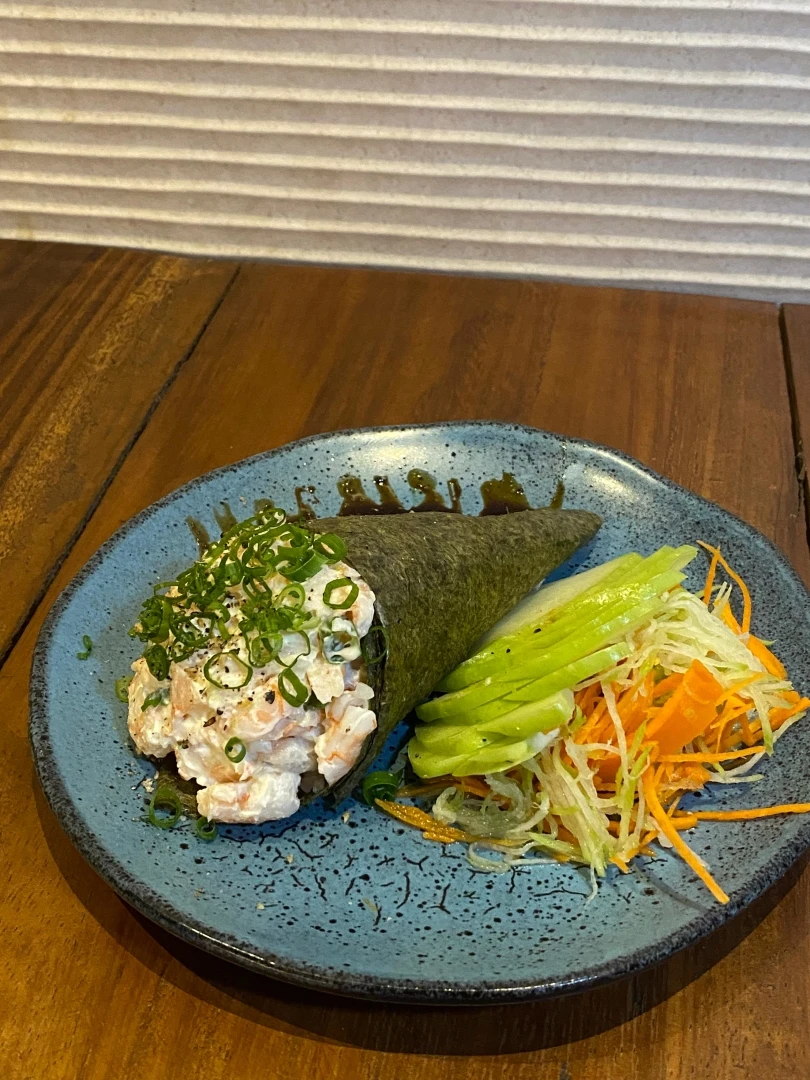 Temaki crock feito na massa de harumaki, com arroz japônes com recheio de salmão. finalizado com teriaki, gergelim e cebolinha.