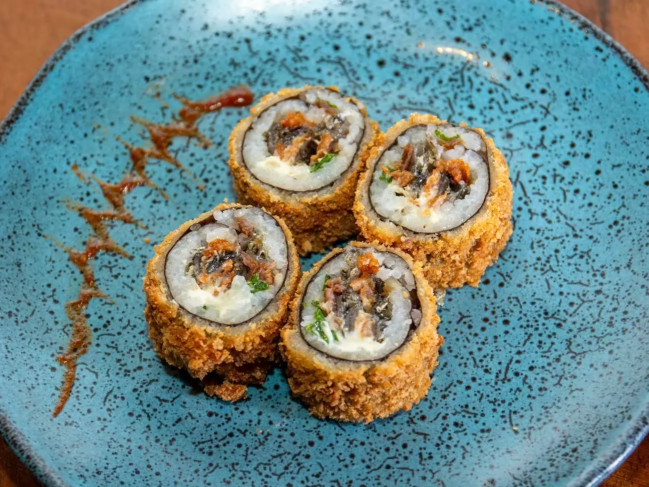Arroz, salmão em cubos, cream cheese e cebolinha.
