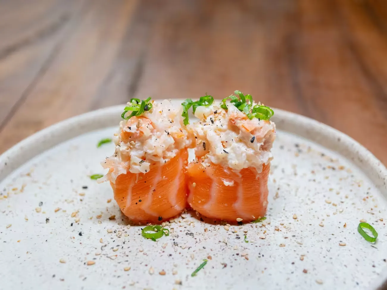 Gunkan de camarão, finalizado no alho e óleo com flor de sal e geleia de maracujá.